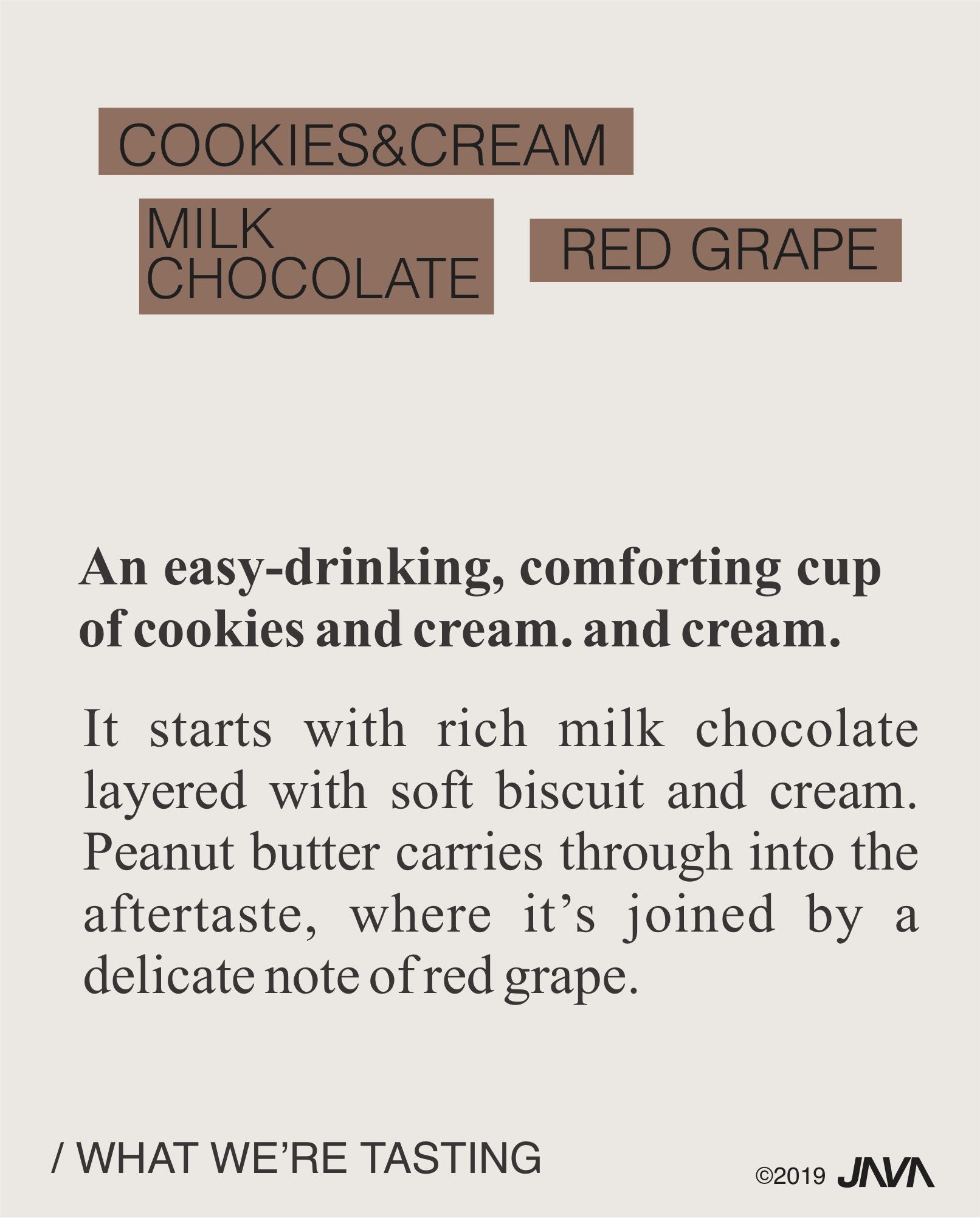 An easy-drinking, comforting cup of cookies an cream. It starts with rich milk chocolate layered with soft biscuit and cream. Peanut butter carries through into the aftertaste, where it's joined by a delicate note of red grape.