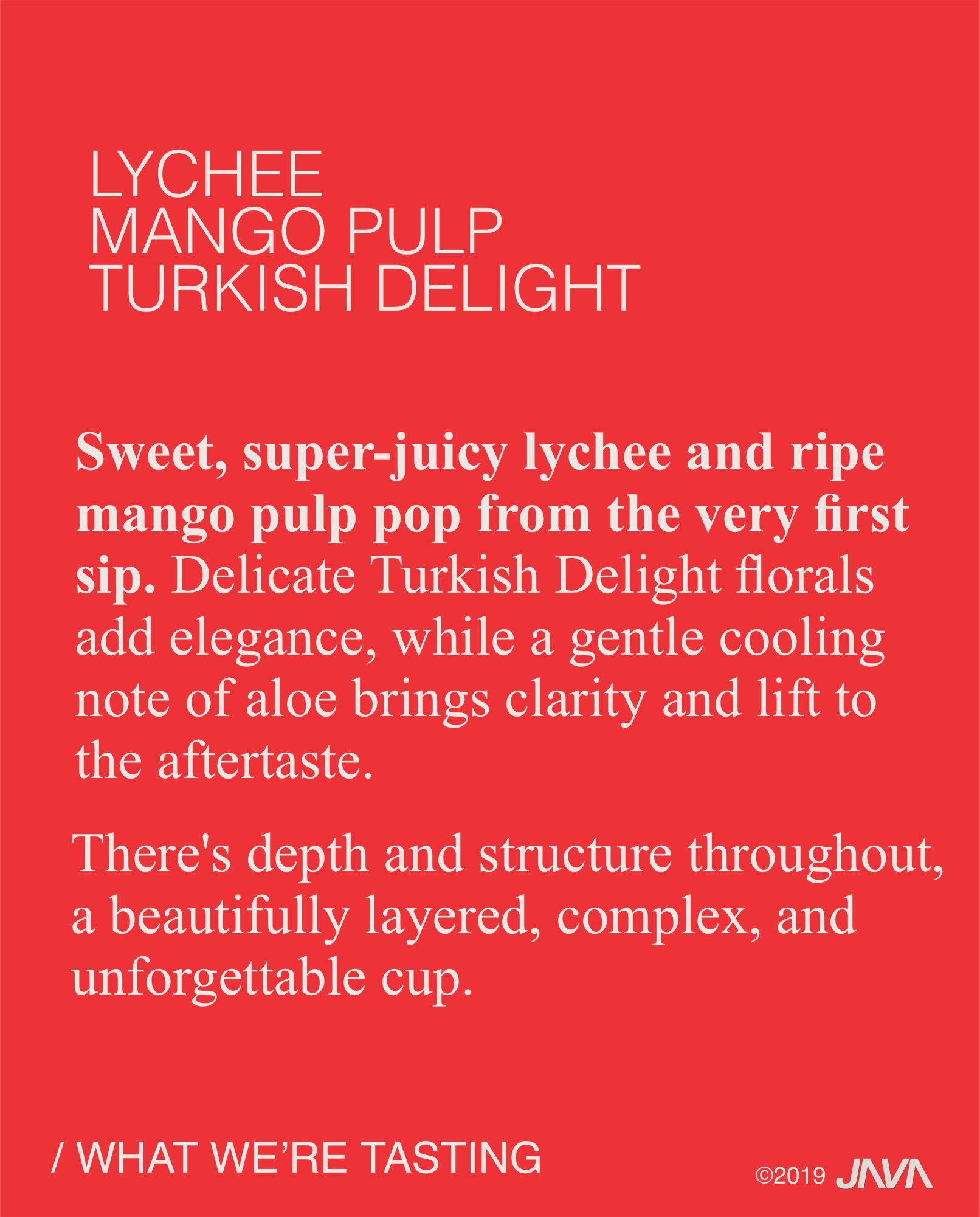 Sweet, super juicy lychee and ripe mango pulp pop from the very first sip. Delicate Turkish Delight florals add elegance, while a delicate cooling note of aloe brings clarity and lift on the aftertaste.